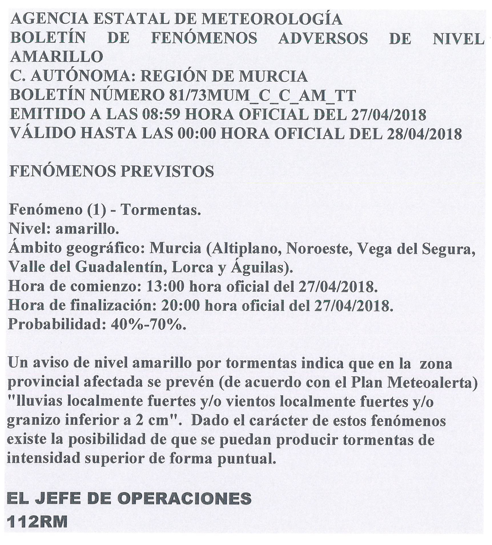 BOLETÍN DE FENÓMENOS ADVERSOS DE NIVEL AMARILLOS Detalles Categoría de nivel principal o raíz: 8.-Información y Atención al Ciudadano Categoría: 8.3.-Participación Ciudadana Publicado: Viernes, 27 Abril 2018 11:31 Visto: 93831 Anterior Siguiente